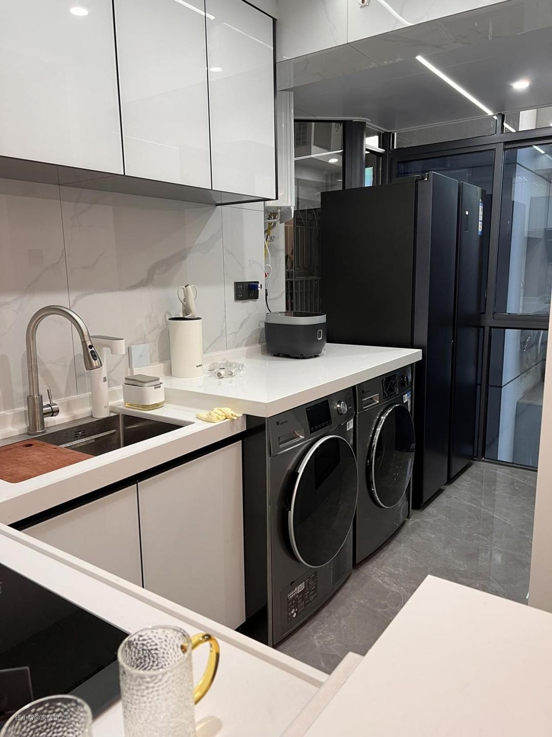 装修时考虑到寸土寸金的阳台用来晾晒衣服太浪费了,就把洗衣机放在厨房,入住一年多了,使用体验感很好,也挺方便的。