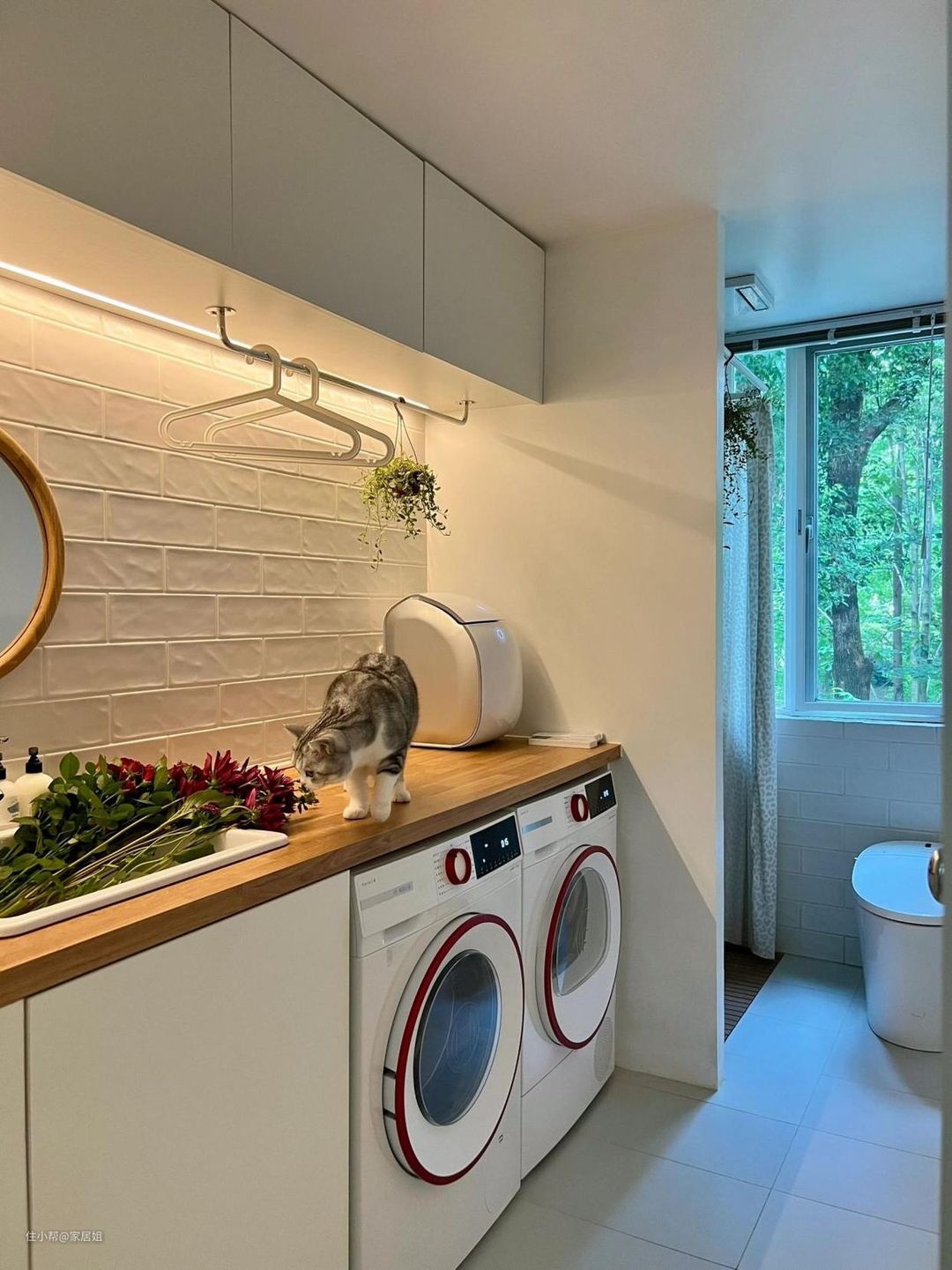放了洗衣机烘干机,算是个简陋版的洗衣房,洗完后烘干机烘干,在台面上叠好衣服,不要太香了。