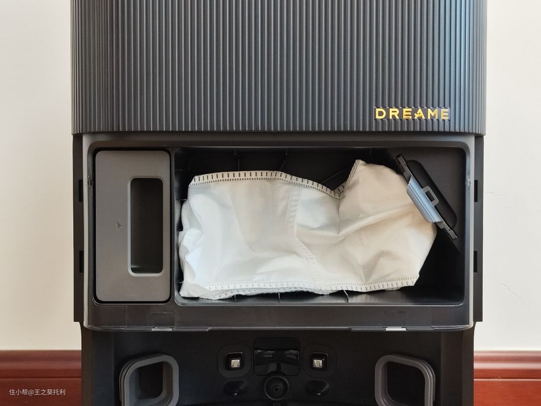 在金色腰线下,是可拆卸的集尘仓面盖。其有隐藏凹槽设计,可以轻松取下。面盖后方右侧是白色的尘袋,其有3.2L大容量,可减少更换频次;集尘袋左侧灰色区域是清洁液自动加注模块,用户可在这里加注清洁液。