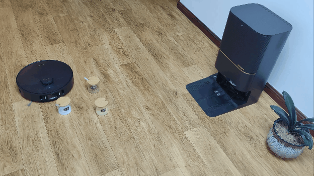 测试时,在地面放置了3个家用调料盒。调料盒为透明材质,内有少量香料,顶部有木色盖子。从图中可以看出,追觅扫地机器人X30 Pro在前进途中识别障碍物后,会主动绕行清洁,过程中完全没有碰撞调料盒,避障效果特别精准。