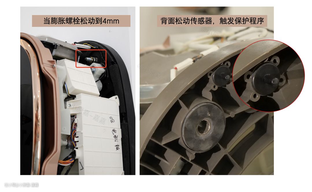这期有测评到的大宇08H壁挂,其防跌落保障是采用的第二种松动感应逻辑:当膨胀螺栓松动4mm感应后即会停止运行,这样的安全保护还是非常必要的。