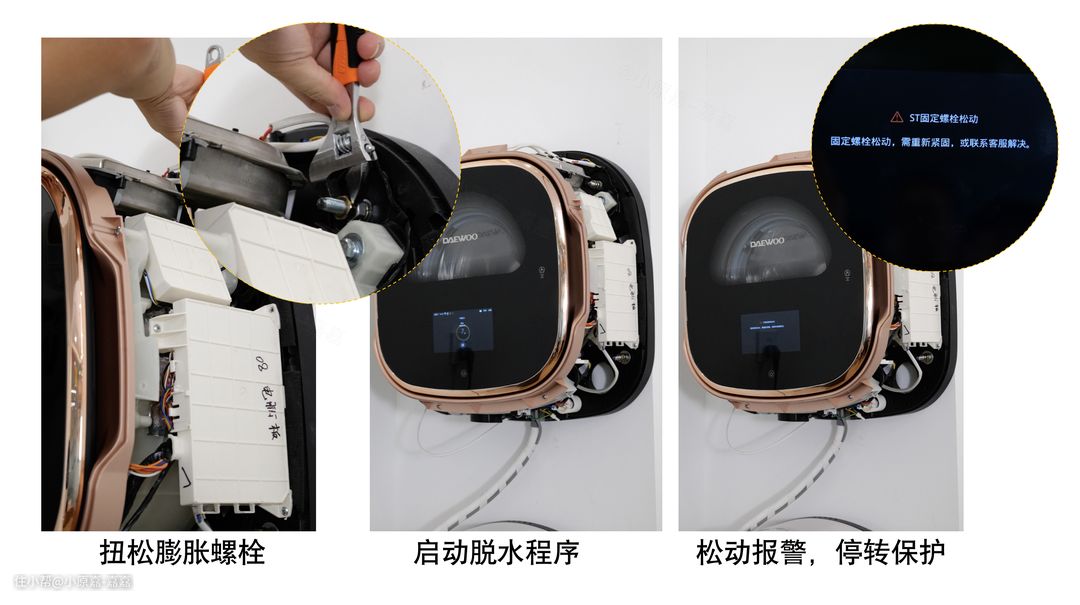 当脱水程序启动一会儿之后,随着剧烈的甩动螺栓松动距离被传感器感应到,机器主动停转保护,同时发出了报警提示音,面板也出现对应松动的文字提示。