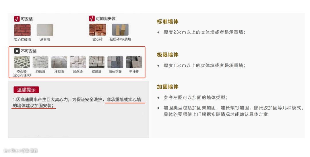 我身边很多朋友,买壁挂洗衣机被劝退的最大顾虑就是,会不会甩干太剧烈掉落下来?的确刷到过蛮多网友壁挂跌落的帖子,大家选购前务必要确认自家是否满足这4个安装条件:承重墙、电源、上水、排水口。