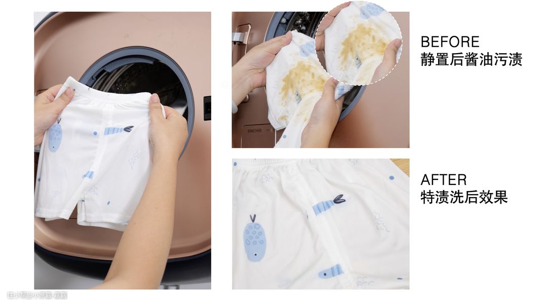 把酱油抹到宝宝衣物上,静置半小时后,放到洗衣机内。这里用到的功能是,08系列针对宝宝专门升级的强力特渍洗,是清洗力最强的程序。(这里添加的洗衣液是常规普通洗衣液)