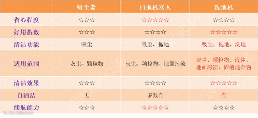不慌,这里给大家列了张对比表,可以清楚直观地对比三类清洁家电的优缺点,然后根据自己的需求点来选择就行了,如果你更看重解放双手,那就选择扫拖机器人;如果你比较注重清洁效果以及使用范围,那就入手洗地机。