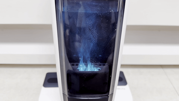 给大家演示下红蓝环的变化,原理就是通过脏污度传感器感应回收污水的脏污程度,然后智能变频调节喷水量和吸力大小,并通过红蓝环显示告知用户,让清洁变得可视化。如果红环显示较多,说明地面还未清洁干净;如果显示全蓝,则说明已经清洁干净了。