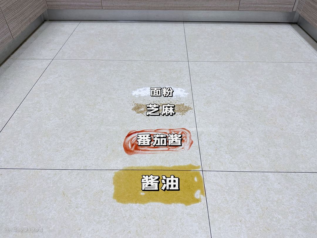 下面就来实测下添可芙万3.0清洁效果,找了4种不同类型的污染物进行测试,面粉模拟粉尘,芝麻模拟颗粒物,番茄酱模拟半液态稠状物,酱油模拟液体,日常生活中遇到的地面污染物也无非是以上这些。