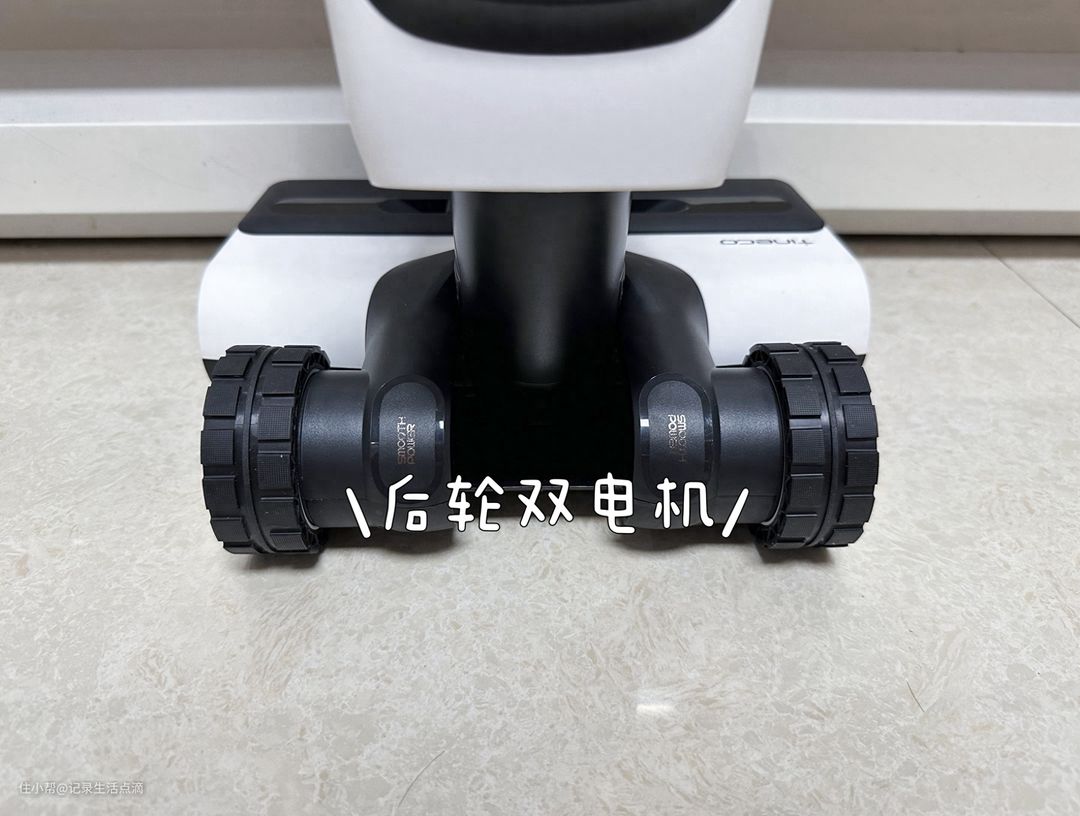 给大家看看添可芙万3.0搭载的双驱电动滚轮,两个滚轮都单独配置了电机。使用洗地机时,不管是向前推还是向后拉都可以很轻松。