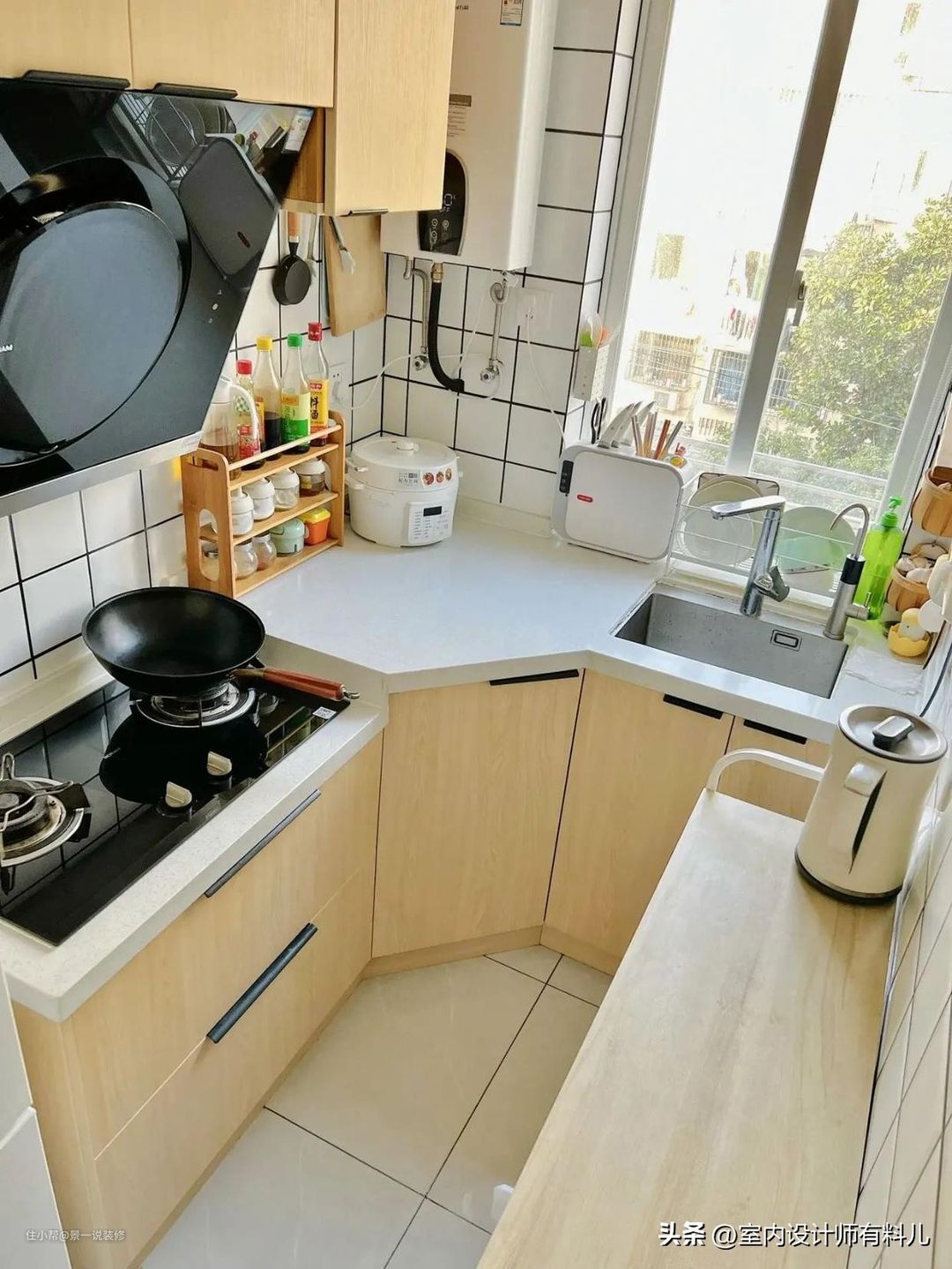 其实,要提升厨房空间的利用率,建议将转角柜改成钻石柜,这样完美解决了所有问题。