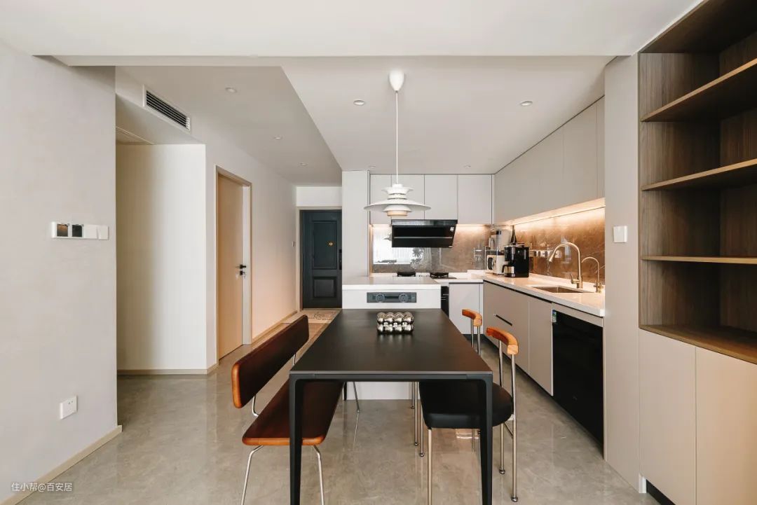 考虑为家人间增加交流互动,也多一些操作台面与收纳,厨房中央增加了岛台,与餐桌相连,空间自然形成洄游动线。岛台侧边安装轨道式插座,方便电火锅插电、手机充电等,贴心又实用。