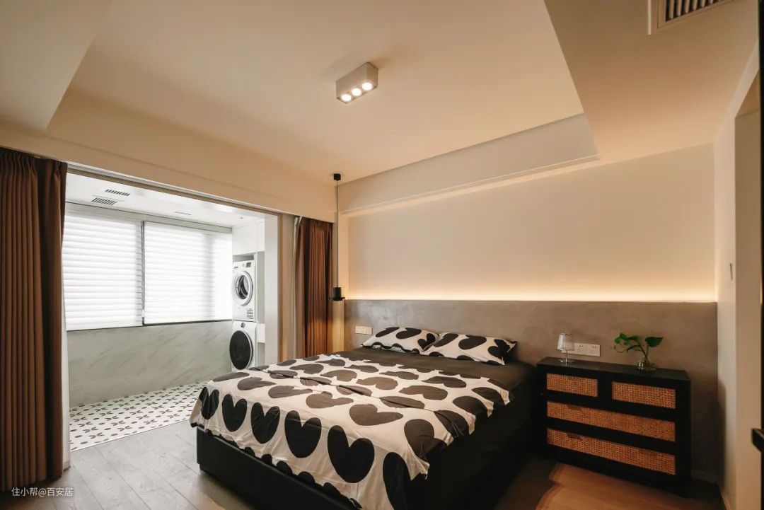 生活阳台纳入主卧,增加空间的实用性,洗衣机烘干机叠放,快速洗烘收纳,无需再增加晾晒区域。