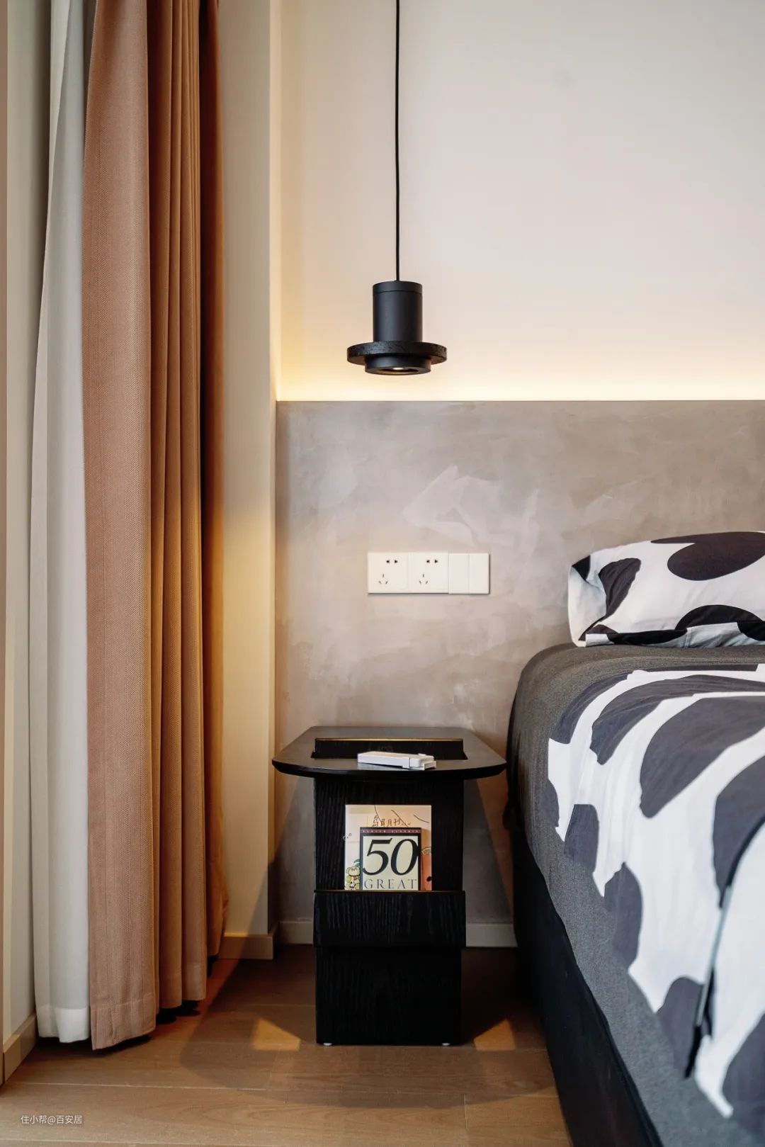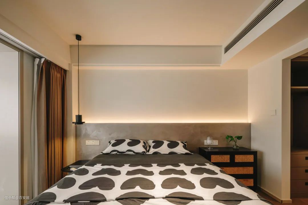 微水泥床头半墙搭配柔性洗墙灯,显得空间低调又时尚。床头吊灯为阅读补光,小几充当床头柜,轻便美观还实用。