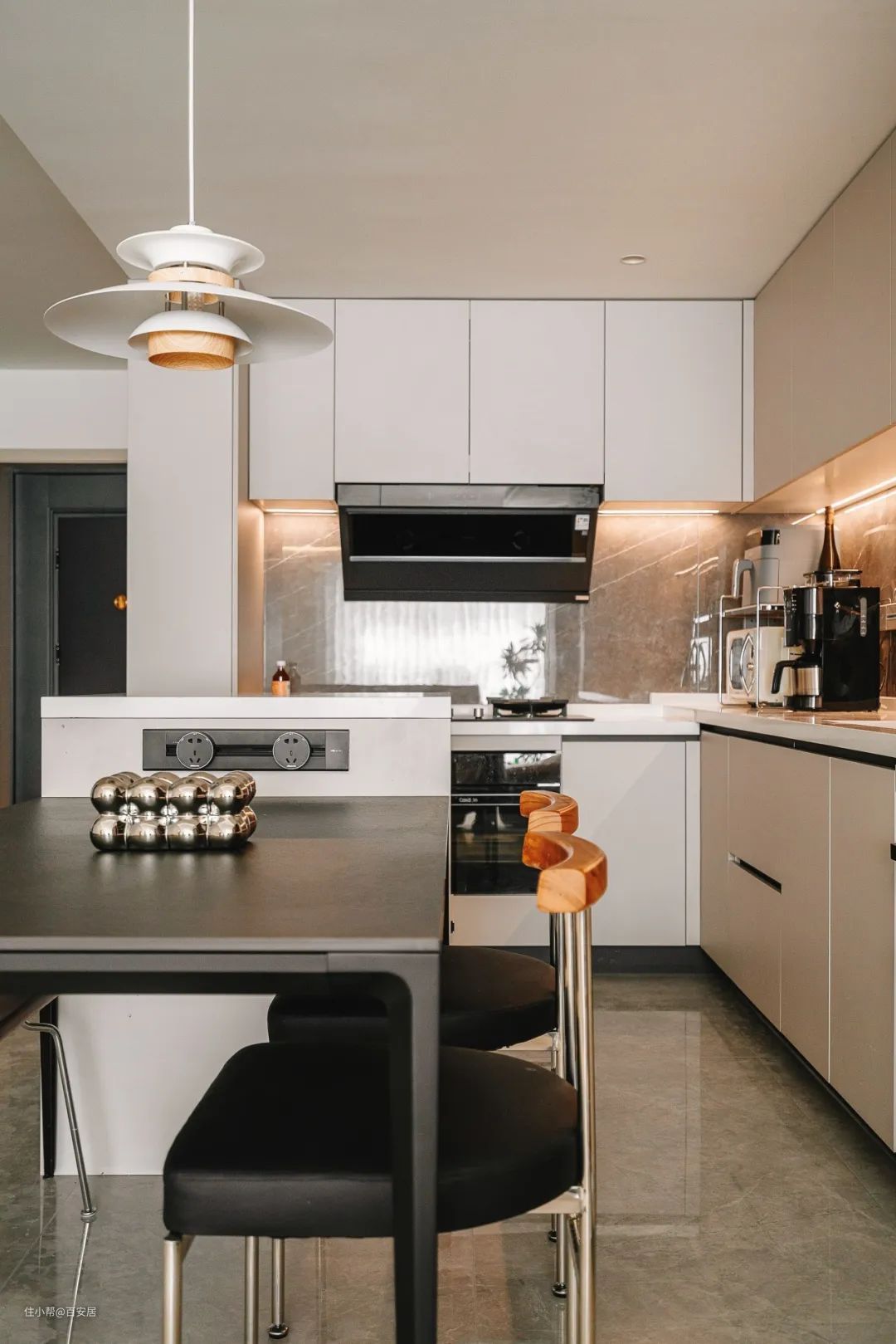 油烟机、燃气灶、蒸烤箱、洗碗机、冰箱等大型厨电均严丝合缝嵌入橱柜,节省空间。空气炸锅、微波炉、咖啡机等必备小家电,借助收纳架摆放在橱柜上,空间整齐有序。可移动的轨道式插座,让厨房用电更加灵活。