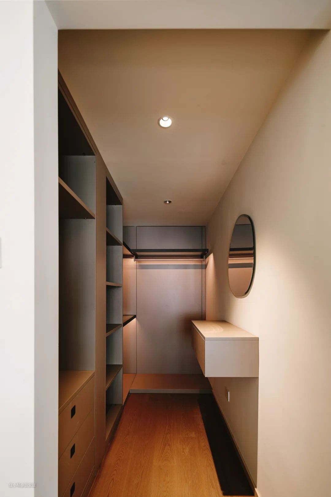衣帽间L型布局,50%的挂衣区+20%叠衣区+20%床品区+10%的抽屉区的收纳分区规划,符合生活习惯,让空间更为实用。