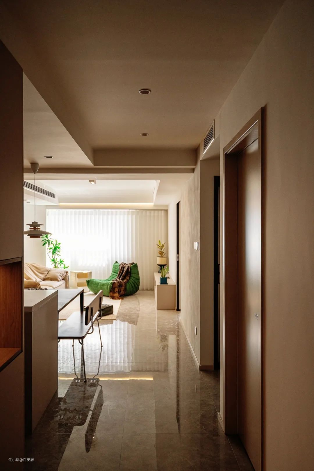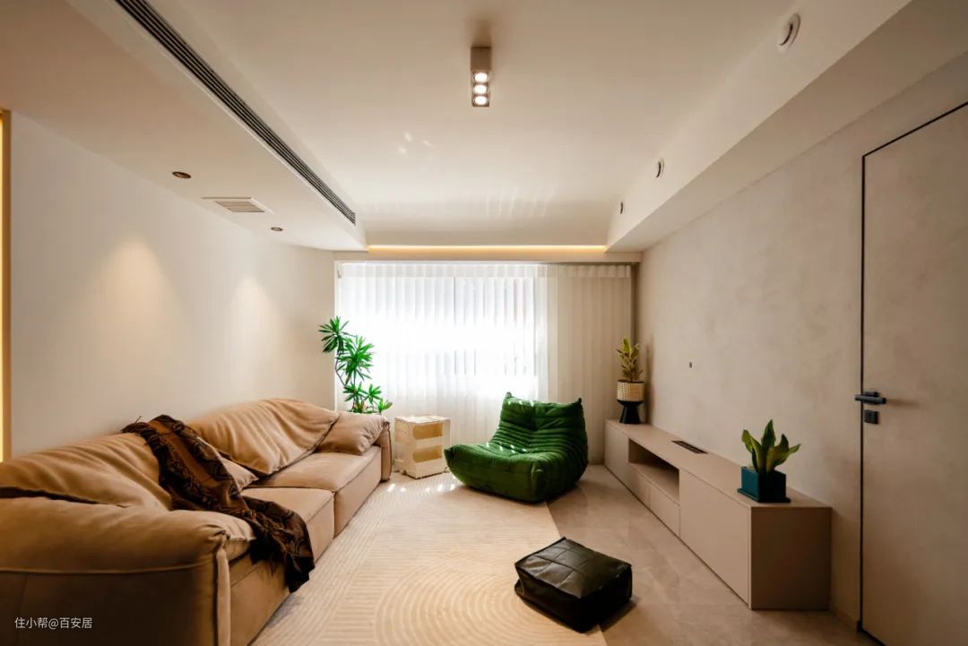 极简风格在客厅体现得淋漓尽致。暖白色的色彩基调,咖色、绿色进行空间点缀,营造出一种宁静舒适的氛围。