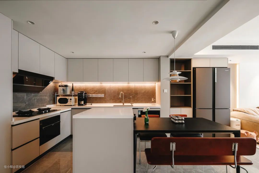 橱柜饰面与墙面乳胶漆颜色统一采用暖白色调,放大空间视觉效果。