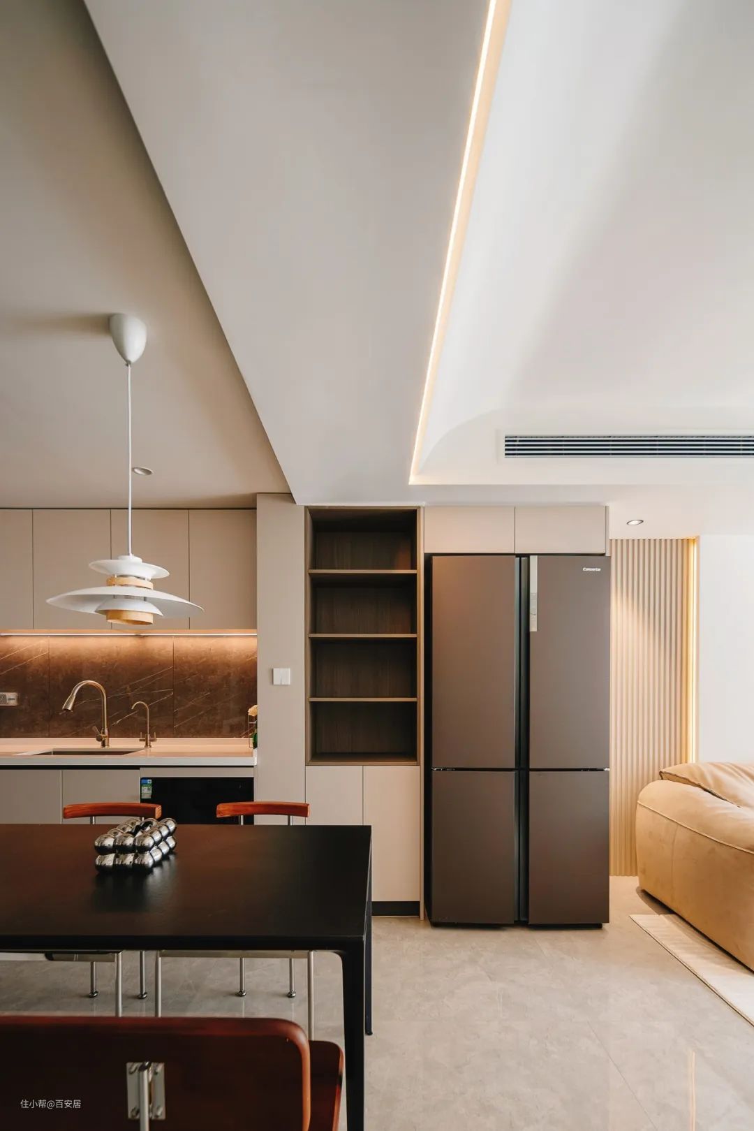 吊柜下方安装隐形灯带,均匀照亮整个台面。中央空调的风口朝向厨房,夏日做饭时也能给厨房降温。