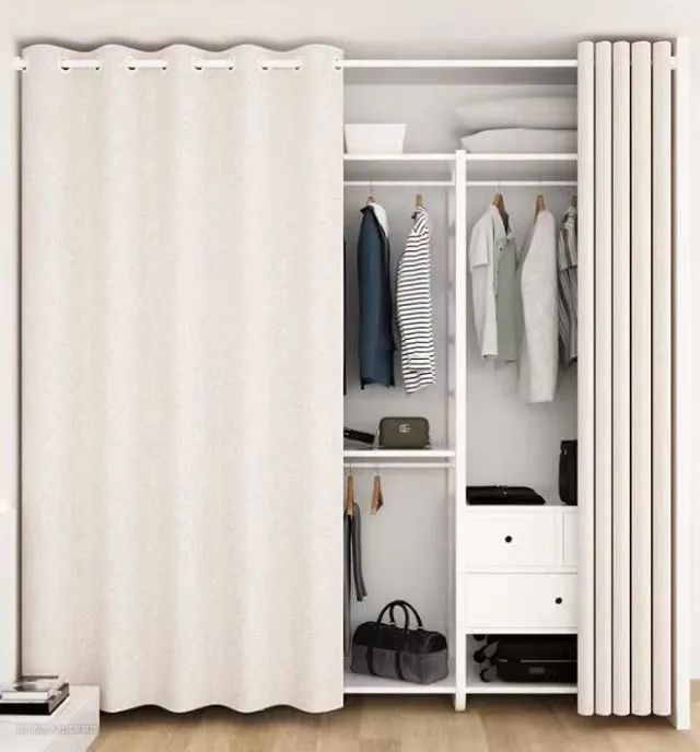如果你想在省钱的同时又能满足基本的收纳需求,简便式衣柜是个不错的选择。只需定好外框位置并装上帘布,就可以随意摆放衣物。想要拿取衣物时,只需轻轻一拉帘布。