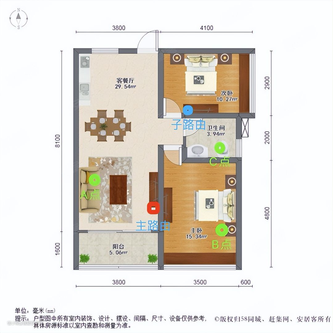 上边这张图是我老家的大概的户型图,我也分别选取了在老路由器下网络覆盖好、网络覆盖中等和网络覆盖较差的三个点ABC作为测试基准。 红色的方框就是入户光纤的位置,我的老路由器就放在这里,而作为没有任何隔挡的位置,A点也顺理成章的成为了网速最高的地方。