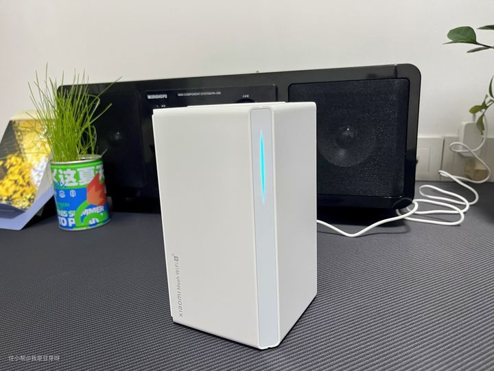 子母路由器都是非常统一的设计风格,基本也就只有高度有所区别,都是采用了内置天线的方案,同时在前侧有一个水蓝色的渐变条装灯效,是那种非常小米的简洁风格。