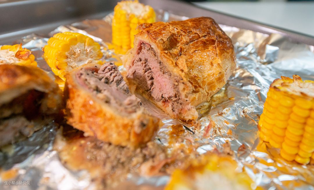 专业烤箱上下管发热, 加上背部热风或者双热风, 可以实现下面这种惠灵顿牛排需要的外酥里嫩的效果。