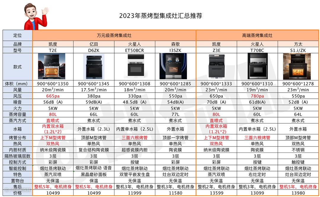 消毒柜式集成灶, 具备烘干, 消杀, 大空间储藏的功能。 我也替大家总结了一下,如下的表格,欢迎下载, 颜色标注是比较优秀的项目, 买的时候, 对比这些参数就可以了, 体积, 风量, 风压, 噪音, 火力,消毒柜容量, 消毒方式, 品牌力, 质保售后。