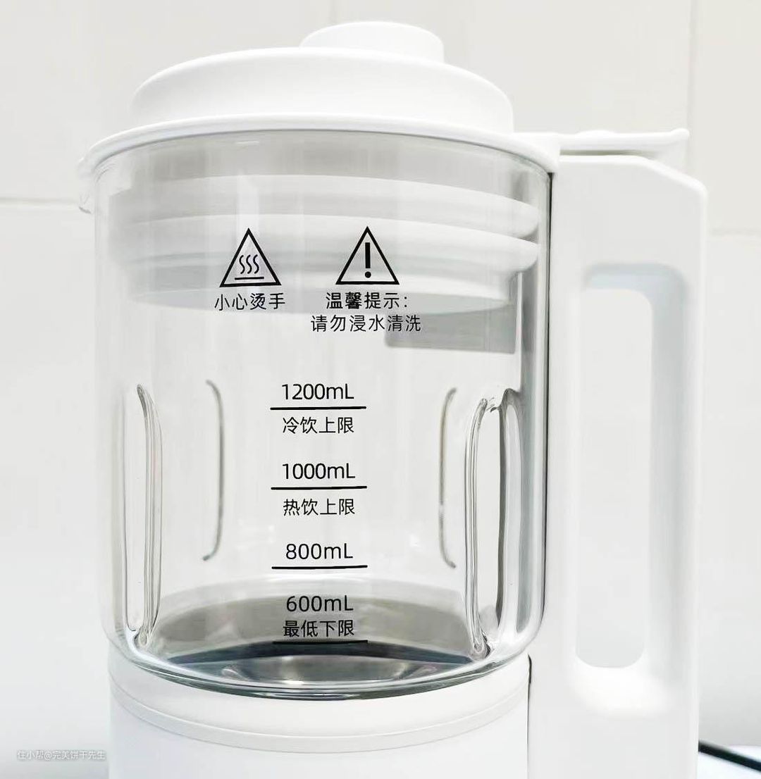 蓝宝蒸汽破壁机的上方则是搅拌杯,采用食品级玻璃制作而成。杯身是有刻度线的,这就很方便用户使用了~整个杯子的容量为1200mL,工作时冷热饮品的上限容量也直接标示了。