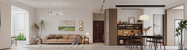整体以白色基调展开延伸,搭配黑胡桃材质的家具,浓郁且复古。电视背景和阳台垭口做了一个关联,弱化承重墙体带来的厚重感,空间融洽舒适。