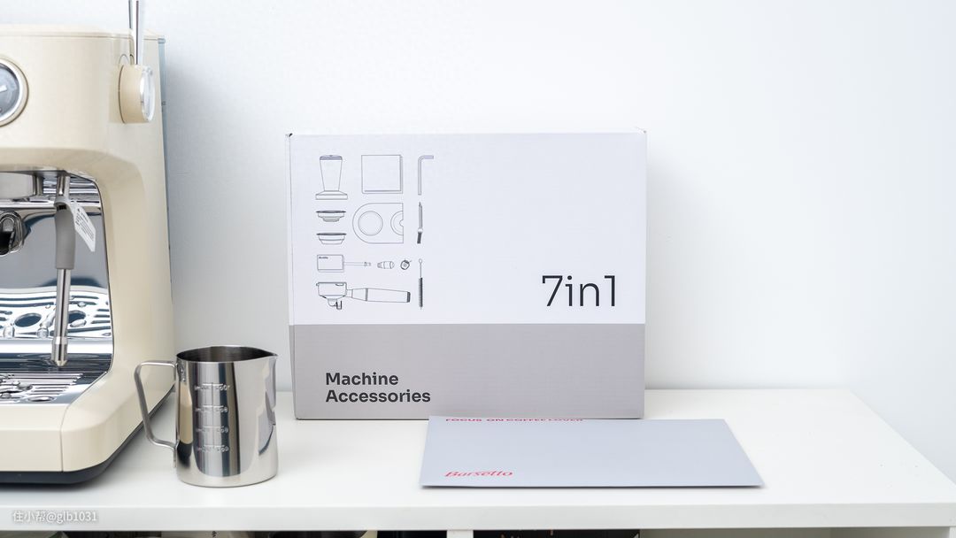 百胜图随机附送的配件是比较全的,包括压粉锤、手柄、单杯粉碗、双杯粉碗、压粉垫、奶缸、毛巾,有了这些东西就可以直接开启制作咖啡之旅了。