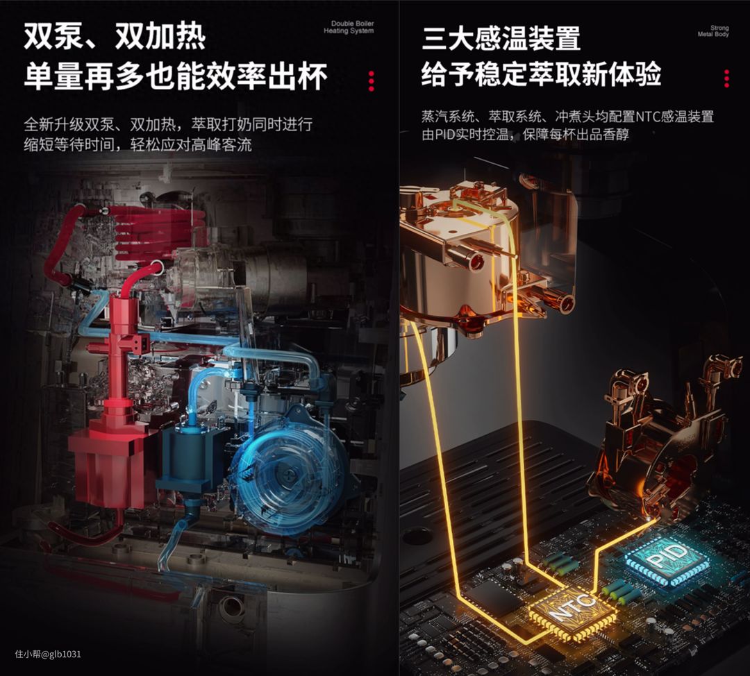 百胜图V1内置双泵、双加热,简单的说就是萃取和打奶是两个不同的泵水加热路径,专线专供,同时内置三大感温装置,实时监控温度,相较于单水路加热更能保证水温水压的稳定,这也就可以做到萃取打奶同时进行。