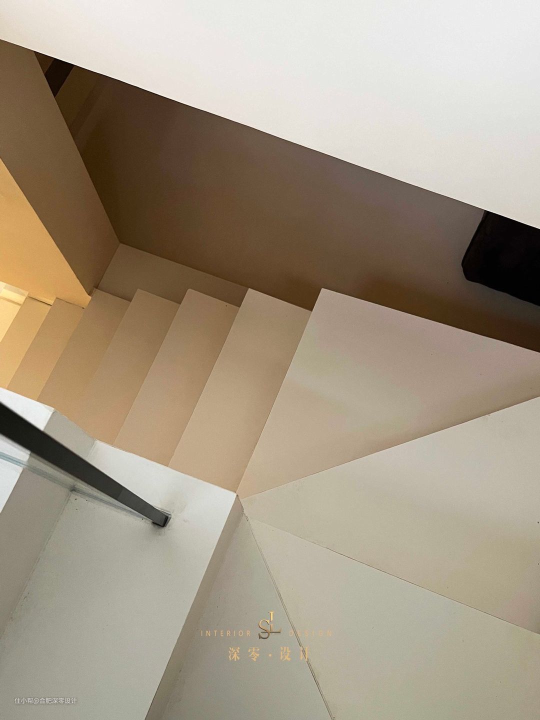 踏步和墙面同色,都是奶呼呼的,一侧小楼梯直通其内,至于另外一侧的折线楼梯则是连通楼上一层,黑框玻璃扶手简洁轻便,从架空的小房间这儿,墙面大面积留空装玻璃,也能注意到上下楼的情况。