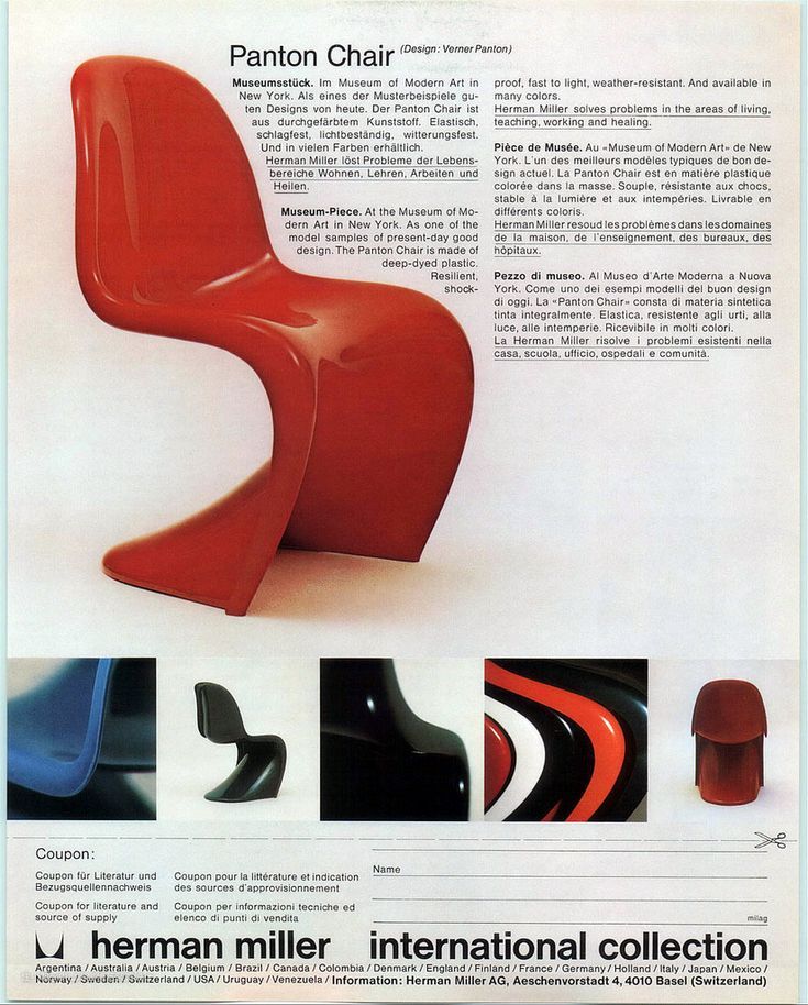 维纳尔·潘顿对塑料进行探索设计出的潘顿椅