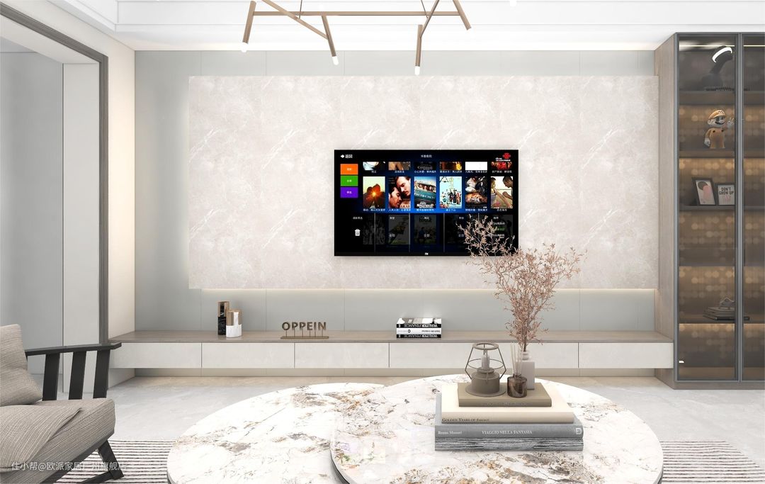电视墙背面以米白色为基调,搭配开放格浅灰色的石英石材质背景墙,充满东方韵味,满满的中国风。