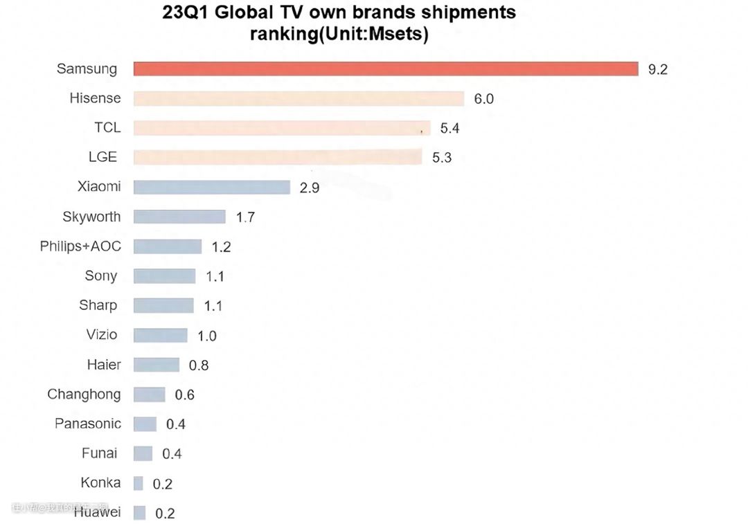 从2023年Q1的全球电视销售数据可以看出,三星依旧有较大优势居于首位,海信和TCL的快速崛起已经超过电视巨头LG。另外国产品牌小米和创维也有不俗表现。主打高端的索尼、Vizio和夏普,全球依旧保留并不算大的市场份额。事实上全球销售和国内的情况基本一致,海信、TCL、小米和创维等国货品牌的崛起,已经开始占据市场重要地位。不过这些品牌的高端型号销量要和索尼、三星和LG抗衡的话,依旧还需要努力。