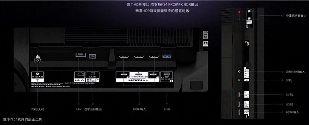 二狗建议认为一台优秀的电视必须具备三个HDMI口,毕竟游戏主机、电视盒子和Soundbar都有的话就已经需要三个接口咯。稍微理想的情况HDMI接口需要四个,其中有两个能够支持HDMI 2.1。