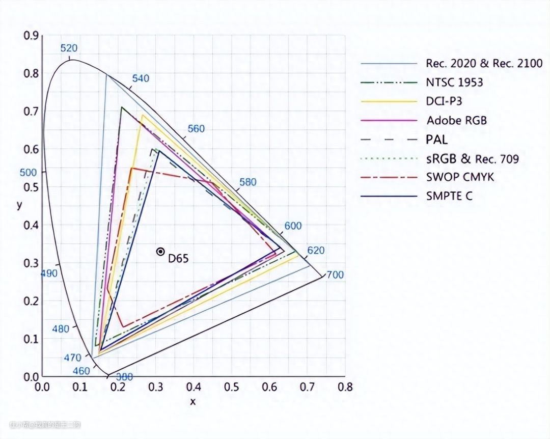 色域又叫色彩空间,是衡量电视画质的重要标准之一。一般来说色域越广越好,广色域包含更多的色彩表现,能够更好的呈现视频的画质。色域范围标准由于没有统一的标准,不同标准下的色域范围有较大差异。色域标准众多常用的主要包括NTSC、sRGB、BT.709、BT.2020和DCI-P3几种,不同标准覆盖的色域范围不同。考虑到NTSC作为计算标准相对通用,习惯性会将其他色域标准转化成NTSC(考虑到不同色域之间并不能完全互相覆盖,这里的转换只是近似)。了解色域的时候一定要清楚电视机厂家使用的是哪一种标准来衡量,对画质要求较高的话尽量选择广色域电视机。