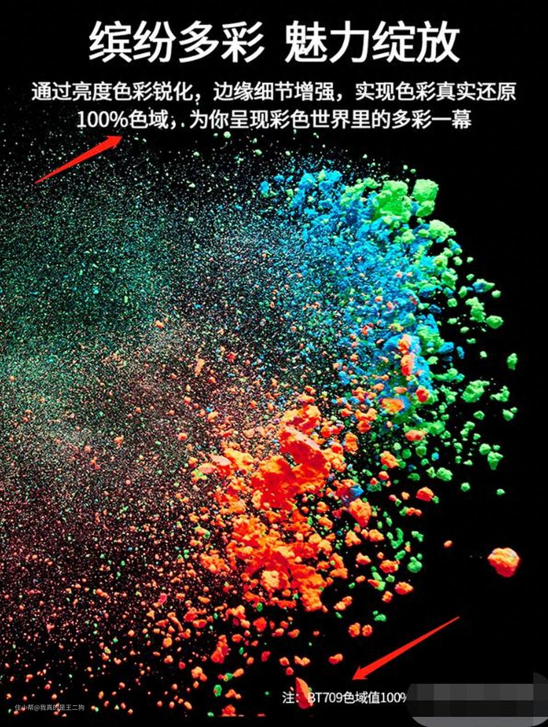 上图所示100%色域表现的电视机,转换后约等于72% NTSC,达不到82% NTSC广色域标准。一些商家的“高级玩法”甚多,小伙伴选择的时候一定注意区分。