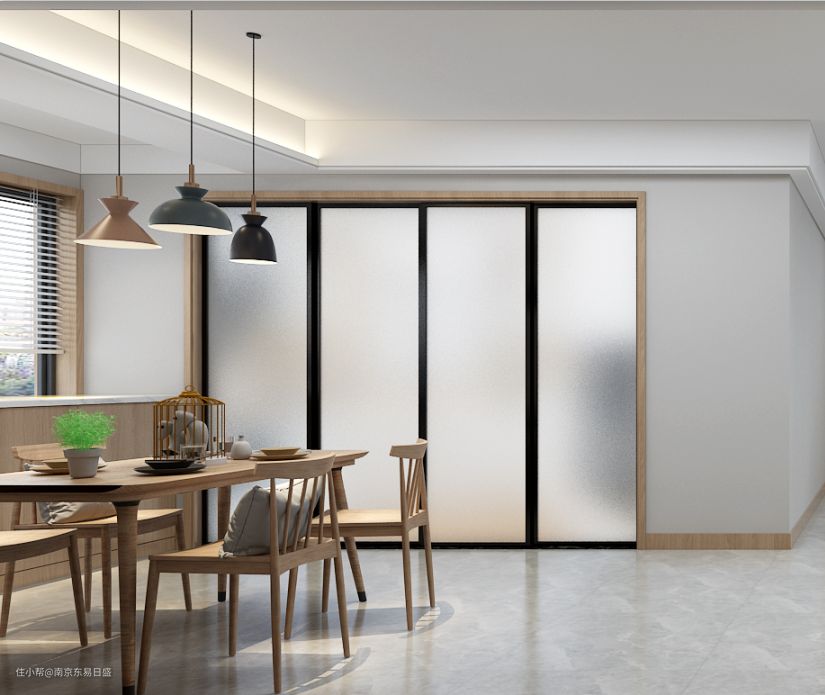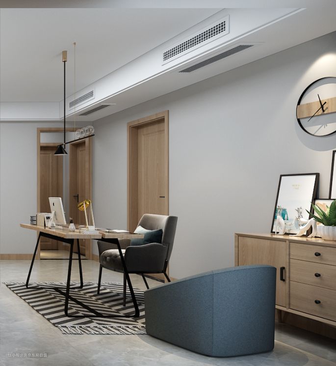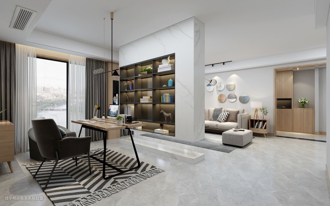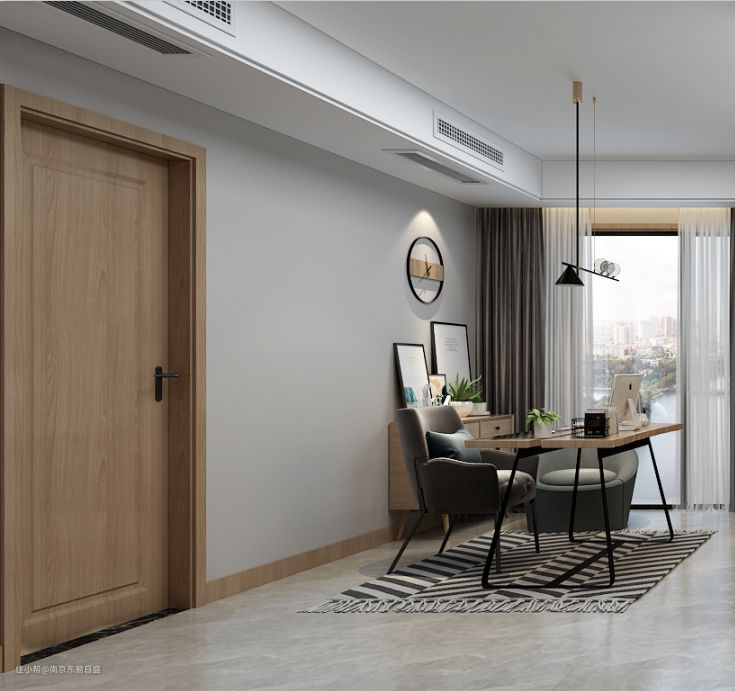 保留客厅原有的功能,分割出独立的办公区域,过道空间保存的同时也为了打造空间的通透感,我们将自然光引进室内,使空间的采光得到保障,呈现出北欧风的简约大气。另外吊顶处做了双层石膏板跌级设计,在不影响层高的情况下弱化梁体的存在感。除了传统的无主灯还使用了线性灯,放大空间的视觉效果。