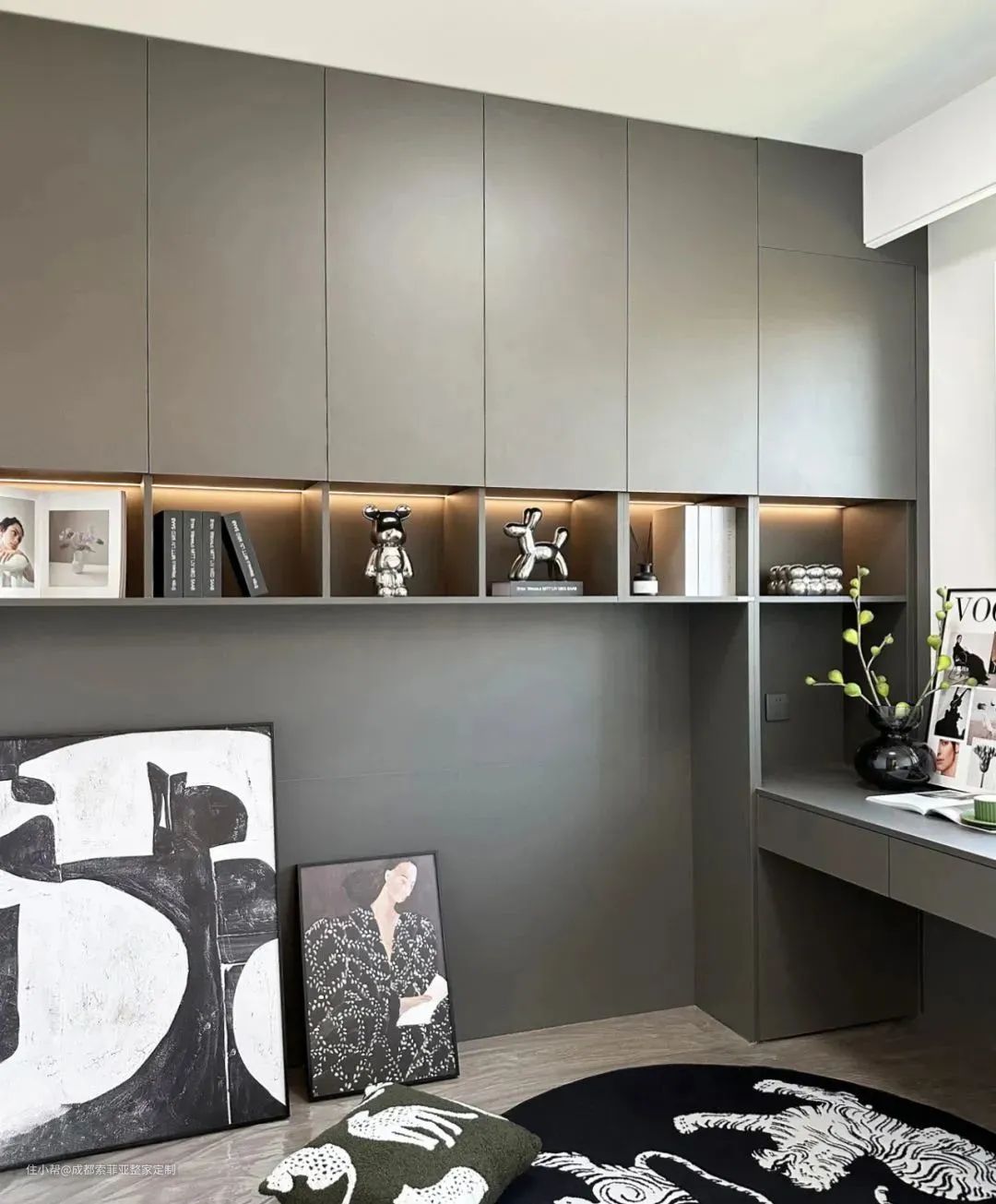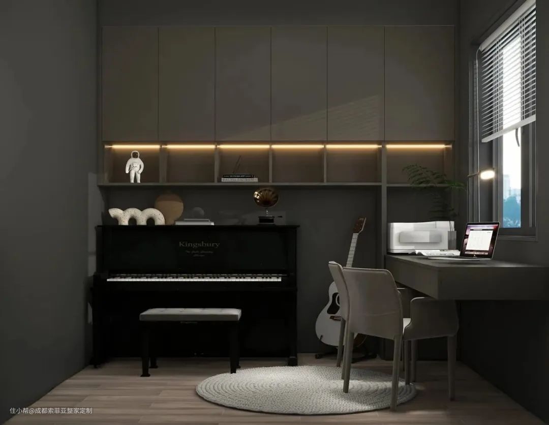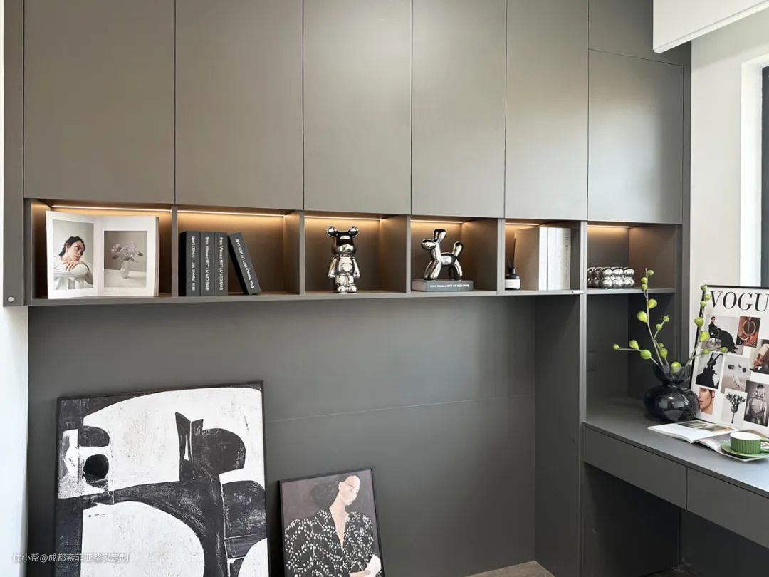 用一间房间改造成多功能书房,整个空间色调选用深色调,带来安静简洁的感觉,让人更容易静下心来。定制书柜与书桌一体式设计,增强了空间的连贯性,兼备美观度与功能性。