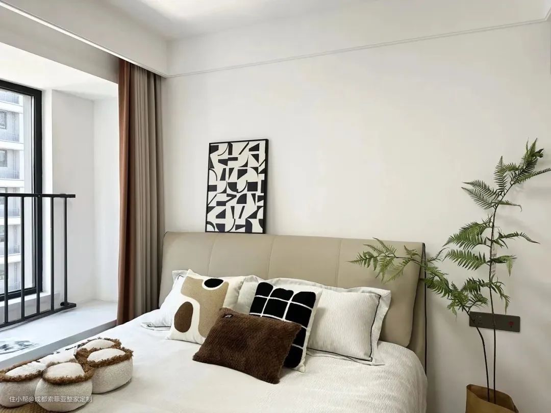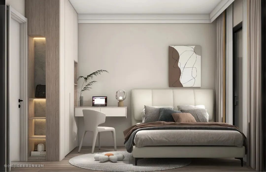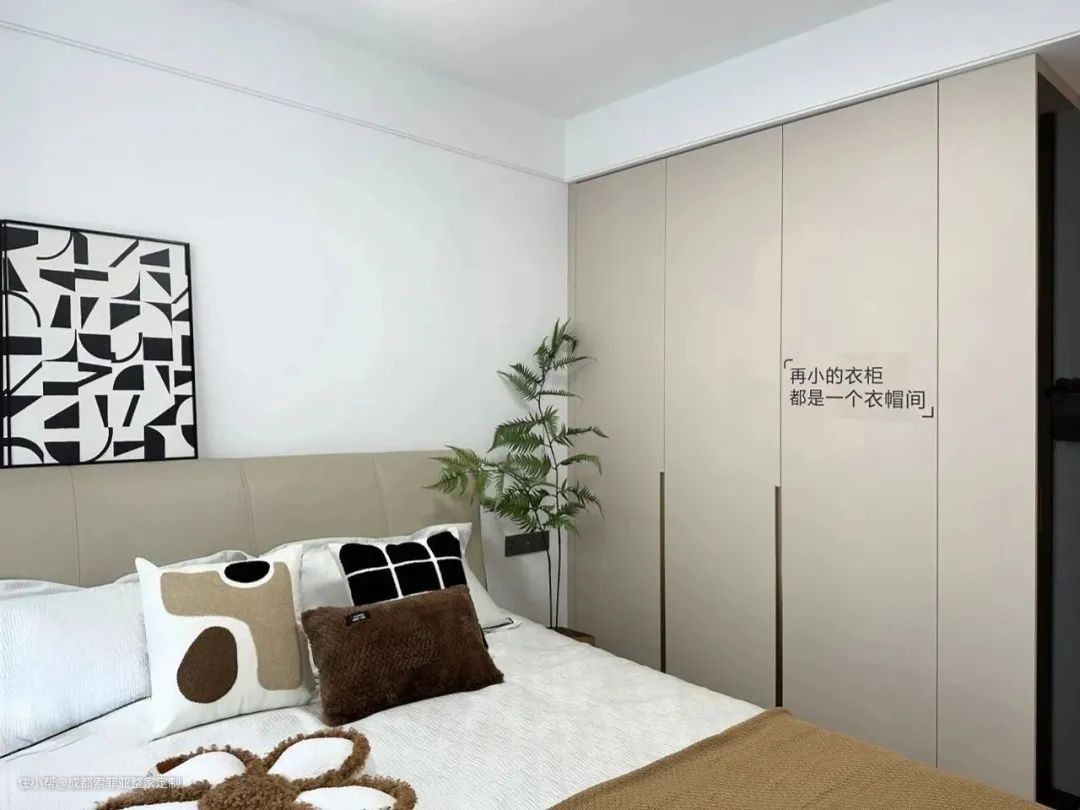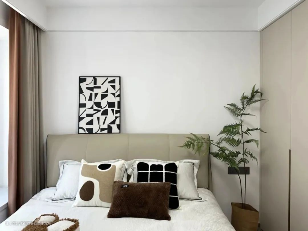 卧室整体设计简洁干净,没有做过多的装饰,让奶油色与现代风相互结合搭配,以营造舒适整洁的氛围为主。靠墙定制一门到顶衣柜,完全满足屋主的衣物收纳。