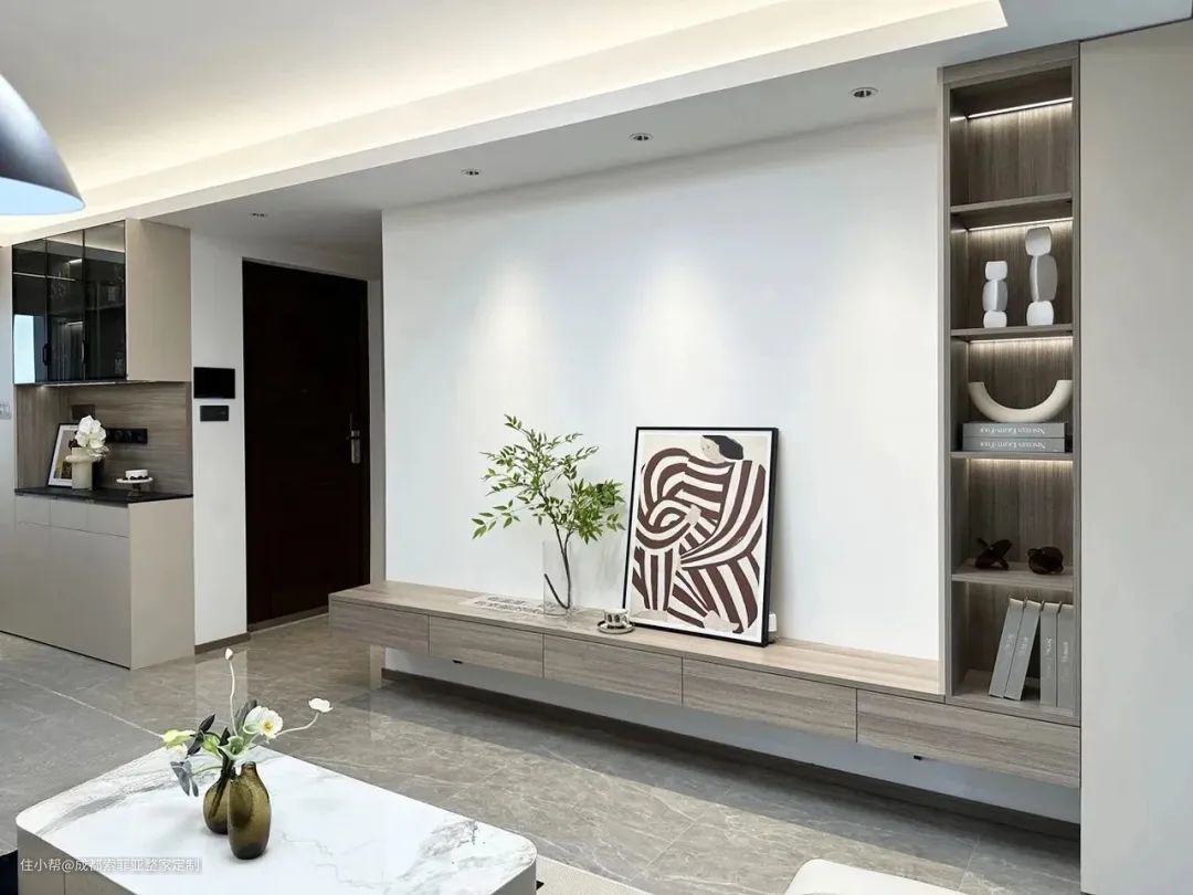客厅的氛围轻松明快,简单干净的硬装,搭配温柔且质感细腻的软装,让空间呈现出一种恬静闲适的氛围。沙发、茶几和地毯选择奶油色系,增加舒适感。电视墙采用L型收纳柜展现空间收纳功能,精致的收藏品陈列于客厅,装点了生活品味。
