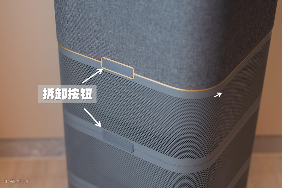 霍尼韦尔H-MAX结构上结合了塔式及圆筒式的特点,设计上非常有“段落感”,怪不得会被称为空间舱。在深灰色的基调下,几种不同的材质/处理工艺搭配下科技感十足。
