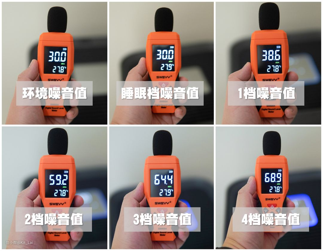 在H-MAX关机状态下,实测的环境噪音为30dB。睡眠档和1档的噪音控制十分出色,特别是睡眠档可以做到与环境噪音一样的噪音表现,基本是不可闻的状态。