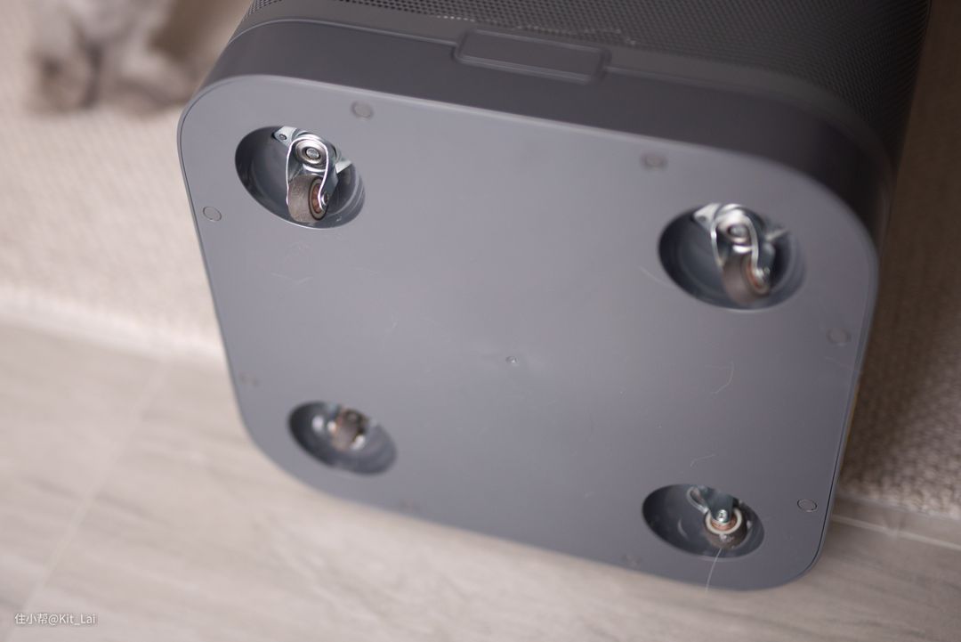 作为一款用料十足的空气净化器产品,H-MAX的体积和重量都算是比较重分量了,所以霍尼韦尔设计了4个静音轮协助便于大家移动空气净化器到不同空间进行使用。静音轮虽然并不大,但推拉H-MAX都十分轻松且安静。