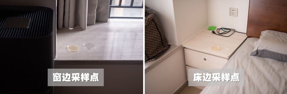 将并未受污染的琼脂培养基,按照H-MAX开启净化的前、后的顺序,分别在测试房间的窗边以及床边两个不同位置,分别打开培养基盖子暴露在空气中5分钟进行采样。