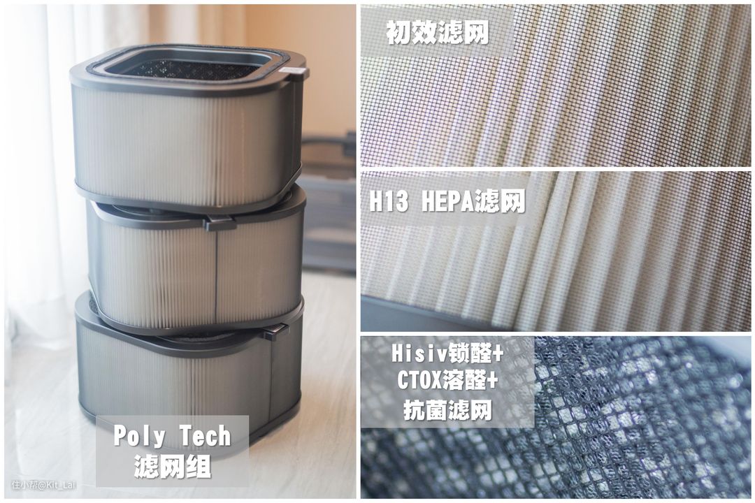 H-MAX三个仓位分别放置一个Poly Tech滤网,这套滤网集合了霍尼韦尔在空气净化器滤芯材质的多项技术。这里Kit也对这套5层结构的复合滤网进行简单介绍: