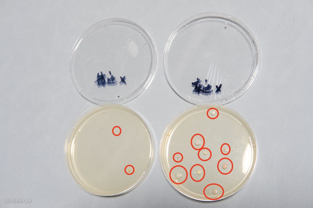 因为这几天佛山气温稍微下降,所以培育时间延长至48小时。空气消毒前采集的样本均有肉眼可见菌落繁殖(红圈内,菌落的种类根据外观应该为葡萄球菌),床边因为生活痕迹更重,菌落繁殖更为明显: