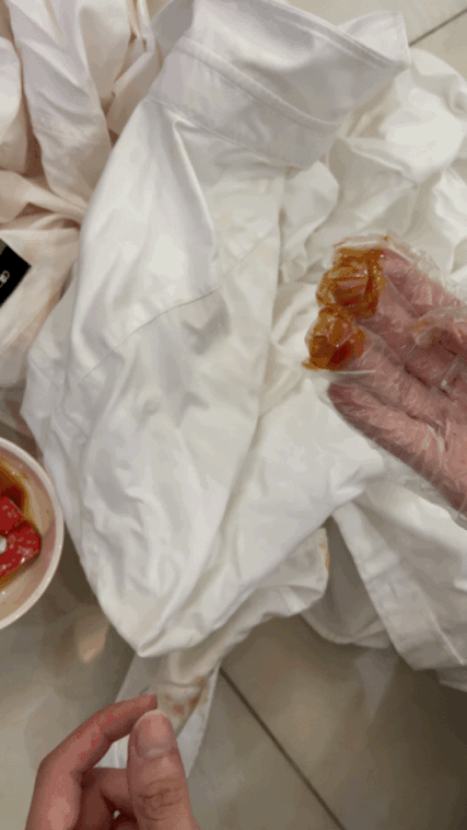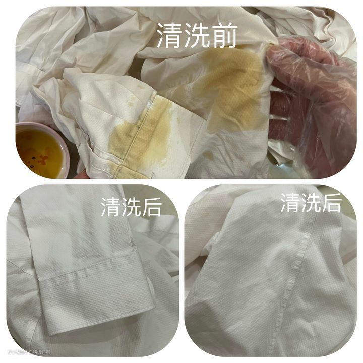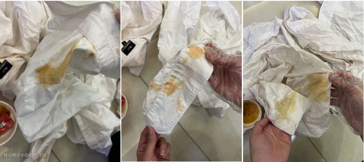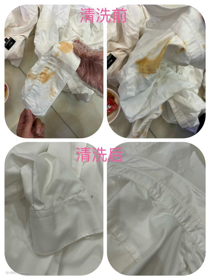 实际效果:我在两件白色衬衣袖口领口分别涂抹酱油、番茄酱模拟日常比较常见的污渍,然后放置一个下午让污渍凝固,特别是衬衣的领口和袖口平时清洁都非常麻烦。