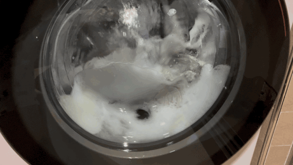 作为洗烘套装自然第一步就是清洗部分,像传统洗衣机你会发现只是单纯的反复搅动衣物产生泡沫,会存在泡沫搅打不均匀,泡沫不充分的情况,传统解决办法就是多多的放洗衣液;而这款洗衣机采用UFB超微泡2.0,通过内置的超微泡引擎可以将空气和水转换成亿万小气泡深入到衣物纤维里面,然后气泡炸裂把顽固的污渍瓦解掉,而且UFB超微泡2.0在之前的UFB1.0基础上升级高活性气泡,这些高活性气泡会把衣物包裹均匀,然后把衣物上的污渍剥离出来实现深度清洁。