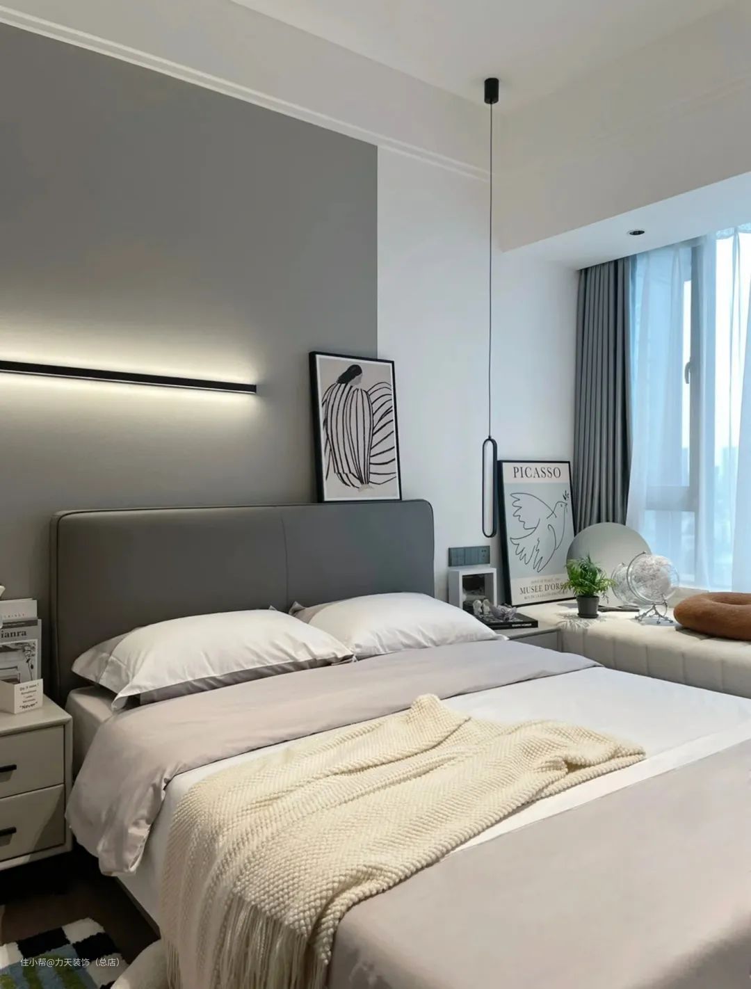 在选择时,建议根据自家空间面积进行挑选,宁小勿大;如果平时有睡前读书、看手机的习惯,安装时可以降低高度,让其靠近床头;如果只是为了烘托环境氛围,则可以稍稍远离床头,视觉上能让床头显得更宽敞。